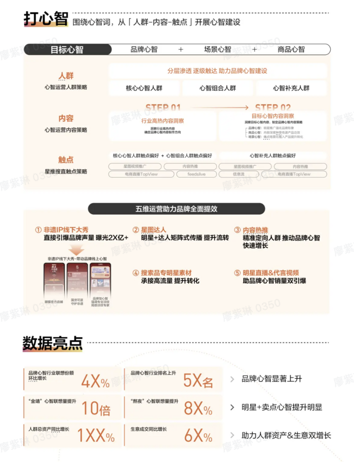 其次,围绕心智词,从“人群-内容-触点”开展心智建设,包括开启非遗IP线下大秀、合作星图达人矩阵式传播、内容热推、搜索品转承接高流量转化以及明星直播。抖音等级号交易平台